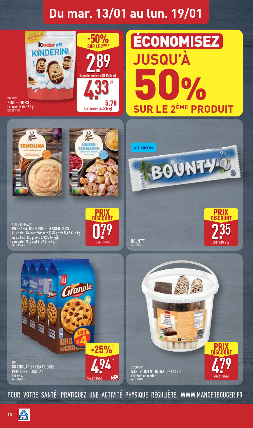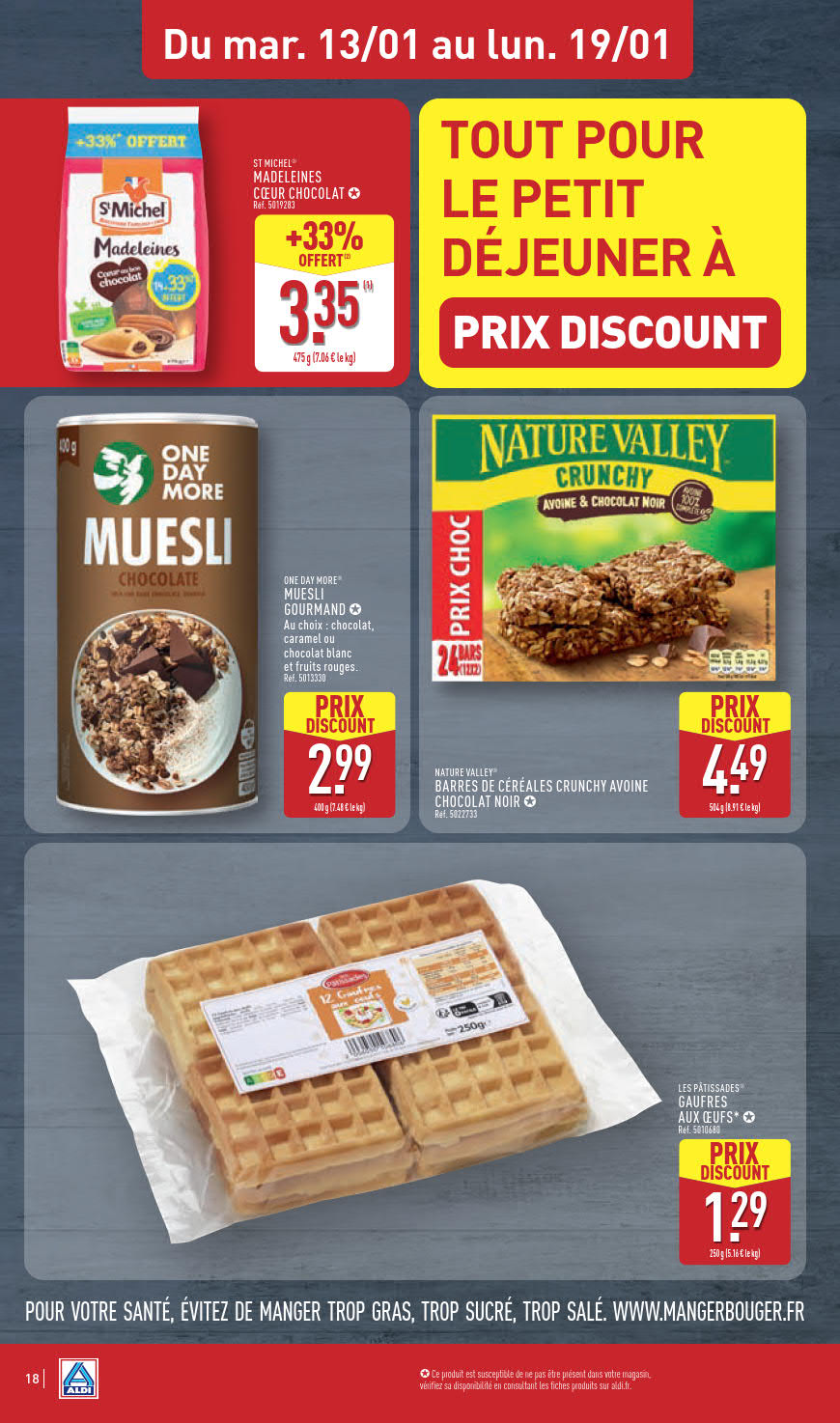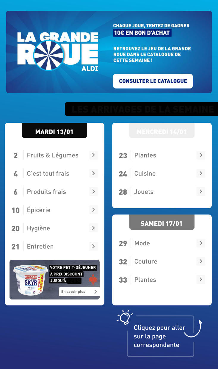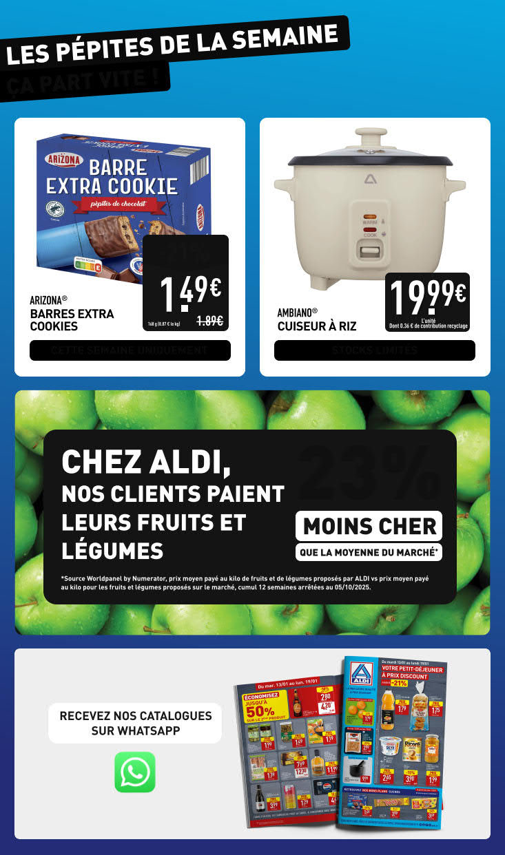 Dernières promotions et le catalogue de ⚡ Aldi valable au 19 janvier. Explorez le catalogue actuel de Aldi, valable jusqu'au 19 janvier.