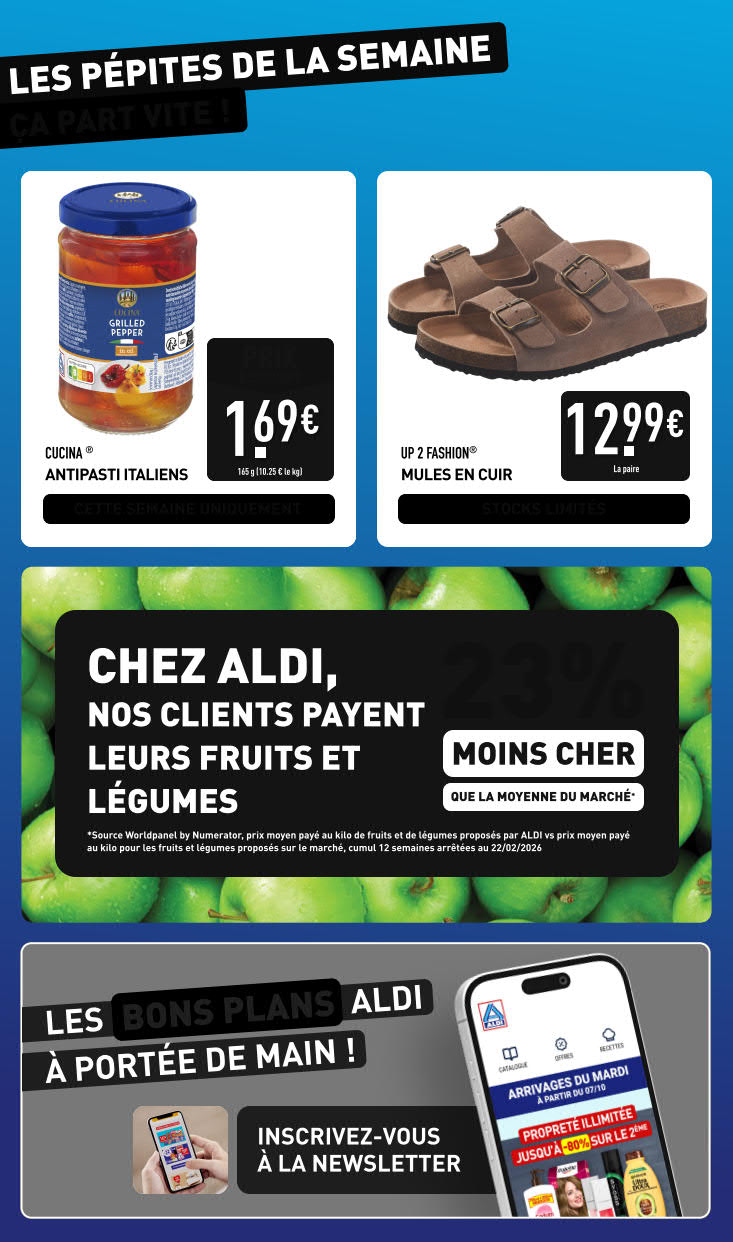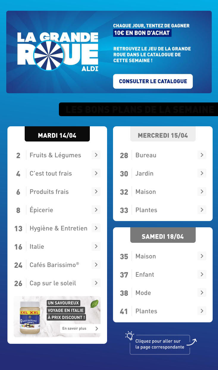 Dernières promotions et le catalogue de ⚡ Aldi valable au 20 avril. Explorez le catalogue actuel de Aldi, valable jusqu'au 20 avril.